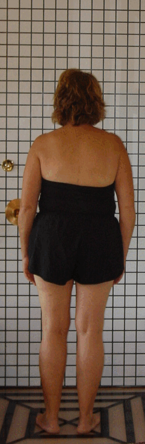 I have been working with my client to get better balance in her structure from a past injury where she fractured her right ankle and had a plate implanted eight years ago. You can see the strain pattern clearly in the right lower leg and right medial knee. We have made good progress in realigning her right leg, working into the adductor compartment allowing the right leg to shift and in the new position provide much better balance in her structure. In the Rolfing process we are very interested in getting more equal weight distribution down each leg.