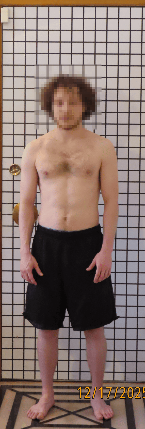 This before-and-after image from a Rolfing® session demonstrates a notable improvement in my client’s head alignment atop his shoulder girdle. According to established guidelines, every inch of forward head posture increases spinal pressure by approximately ten pounds, potentially causing the cervical spine to support double the weight of the head or more. My client’s lateral line is visibly improved with less flexion in his thighs as his head returns to a more optimal position. Forward head posture may reduce lung capacity by restricting elevation of the first rib during inhalation, and it can contribute to premature degeneration of intervertebral joints. Rolfing® empowers clients to become aware of their postural habits outside of sessions, providing them with strategies to support lasting integration.
